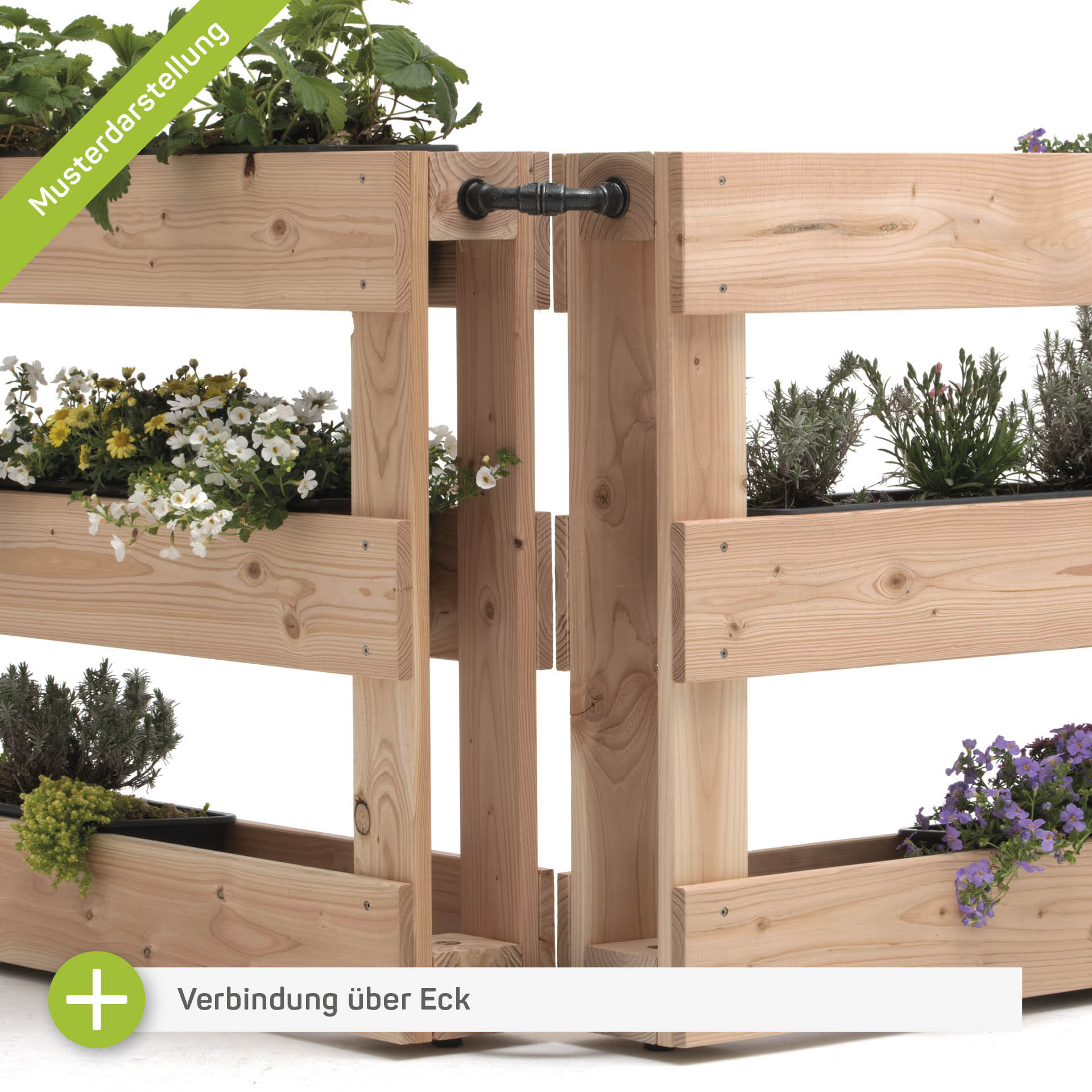 Stelle selbst einen eigenen Vertikalgarten zusammen und erweitere die Pflanzecke mit Modulen aus dem +PAL Baukasten! Nnimm dazu so viele SKYo… Module Deiner Wahl aus dem +PAL Baukasten und verbinde diese mit dem Verbinder Sets Ecke (VE45K) – Fertig! Ein Verbinder Set hält je zwei Pflanzmodule auch ohne Pfosten sicher im 90 Grad Winkel zueinander. Durch den Winkel der Module haben unsere Pflanzecken einen stabilen Stand auf ebenem Boden. Die Module heben sich durch Stopfen (1 x ST04) vom Boden ab, so dass kein Holz im Wasser steht. Das freistehende Pflanzgestell eignet sich indoor und outdoor: